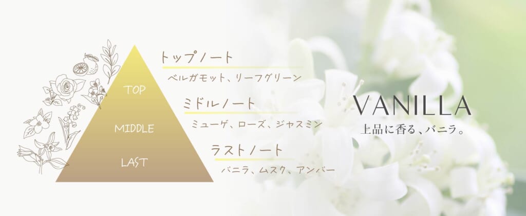 つけ始めに爽やかなグリーンやシトラスを感じさせることで、バニラ特有の重さを軽減しています。