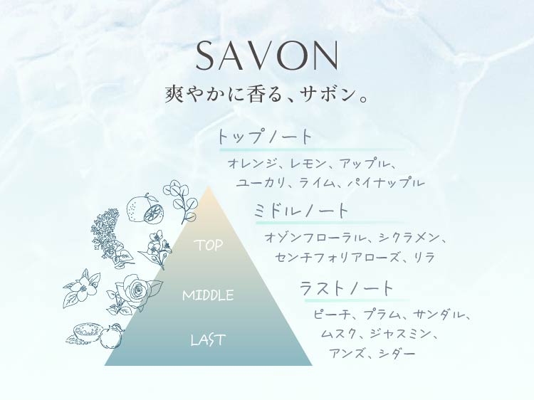トップノートの爽やかさで目覚め、ミドルノートの華やかさで気分を上げ、ラストノートの温もりでリラックスする。